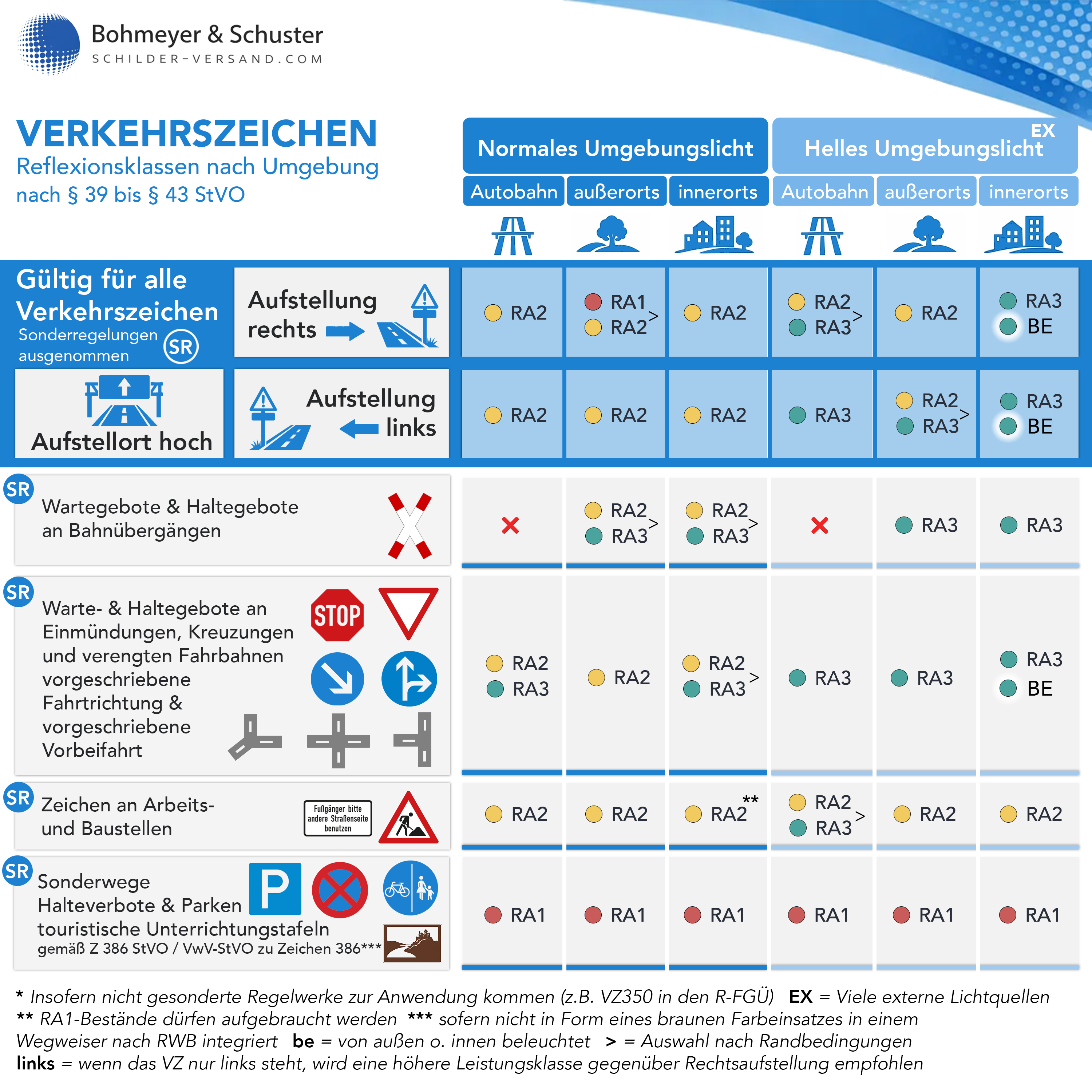 Verkehrsschilder, die Reflexionsklasse der Folie (RA 1, RA 2 und RA 3), die